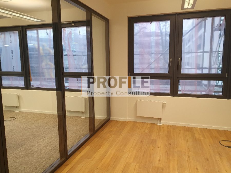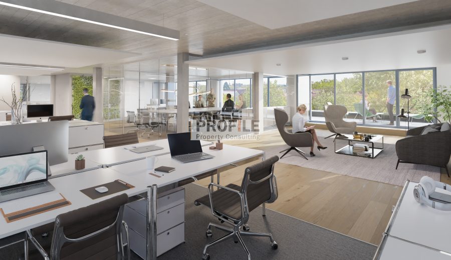 Die Büroflächen des modernen Neubaus sind verteilt auf drei separate Hauseingänge. Jede Büroeinheit ist mit Hohlraumböden ausgestattet, barrierefrei und flexibel im Grundriss einteilbar.